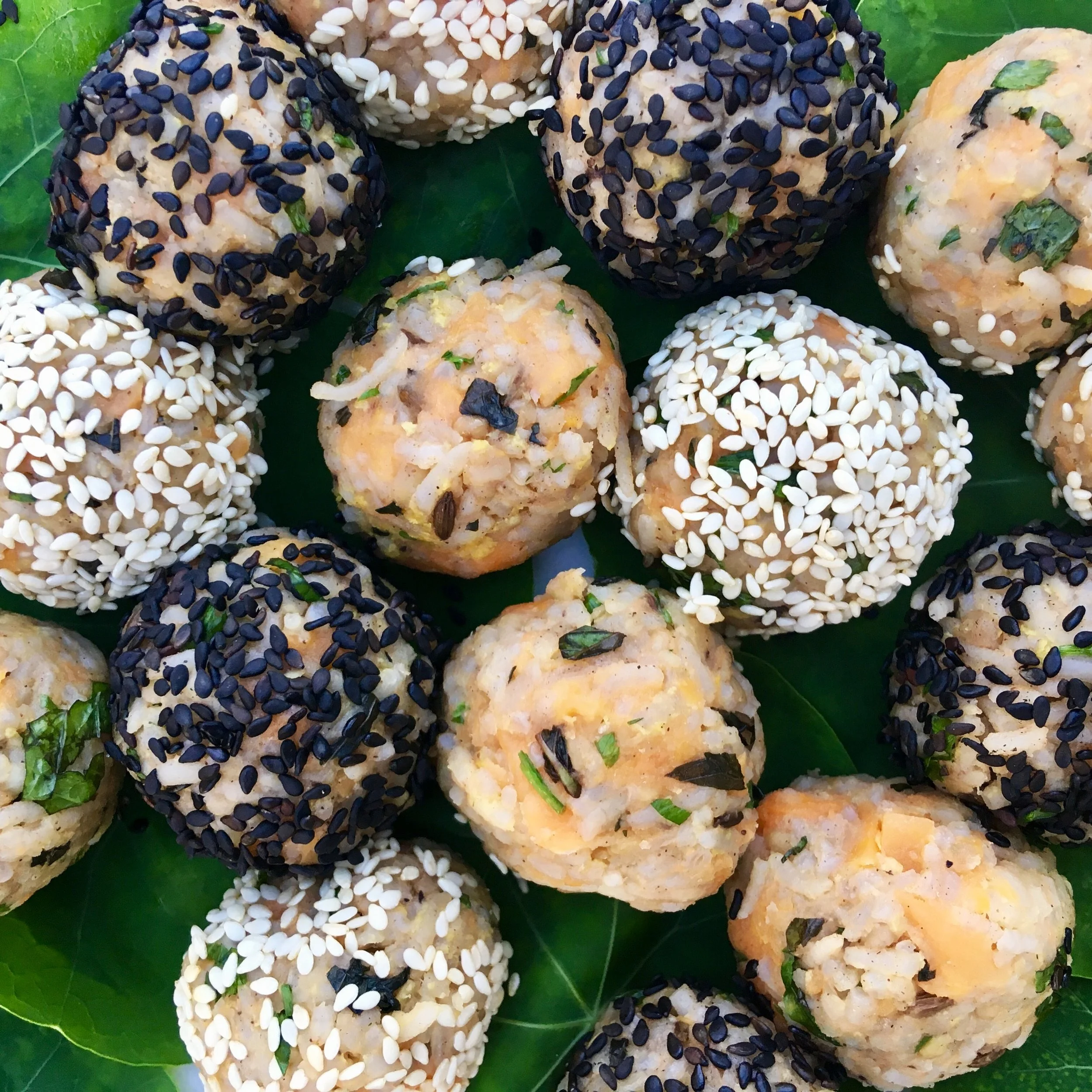 - When the rice-herb mix is cool enough to handle, put into a bowl and add the mashed sweet potato. Mix well.